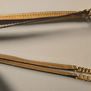 Elegant gold tote bag with chain straps. Perfect for any occasion.