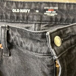 Greyish black jeans that feature high rise, curvy wide legs, and secret smooth pockets.