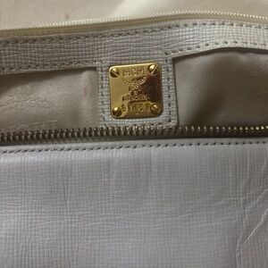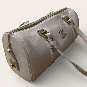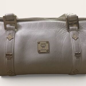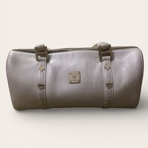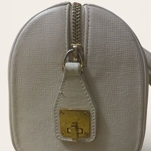 This is a MCM Papillon barrel bag (also known as a cylinder or Boston bag) made of white leather with gold-tone hardware. This is a vintage style from the brand's original "Visetos Collection". Preloved still in good condition.