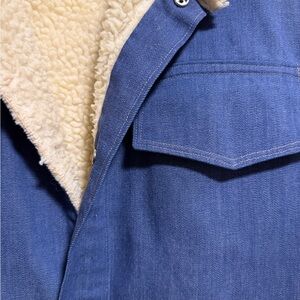 Vintage blue denim vest with cream sherpa lining, featuring four pockets. Quality, warm material. One of a kind as indicated on tag.