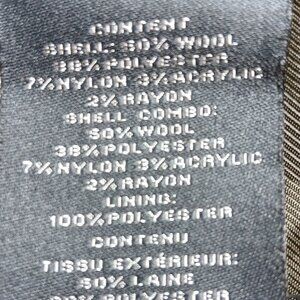 FABRIC: 50% Wool, 38% Polyester, 7% Nylon, 3% Acrylic, 2% Rayon