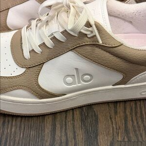 Stylish ALO Yoga sneakers. White and tan design. Comfortable fit. Perfect for casual wear.