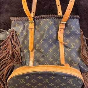 Elevate your style with this luxurious brown and tan monogram shoulder bag. Featuring elegant fringe details, it's perfect for adding a touch of sophistication to any outfit.