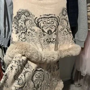 Elevate your wardrobe with this chic beige cape, adorned with luxurious faux fur and elegant floral accents. Perfect for a sophisticated look.