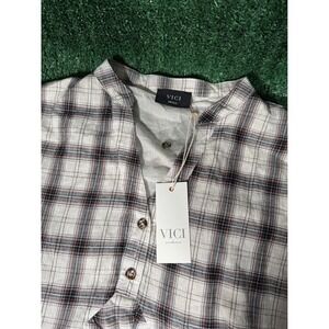 VICI Exclusive plaid button front shirt dress in women's small. This stylish dress features a classic plaid pattern in neutral tones, short sleeves, a V-neckline with a band collar, and a flattering tiered design with ruffled detailing at the hem. The fabric blend of 98% cotton and 2% spandex offers comfort and a slight stretch. Care instructions recommend hand washing separately in cold water, no bleach, and hang drying or cool iron if needed.