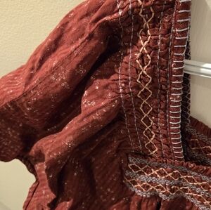 Boho cinnamon brown blouse with a square neckline. Features roomy short sleeves and intricate detailed light blue embroidery. Ideal for easy casual looks. Measures approx. 28" L x 27" PTP.