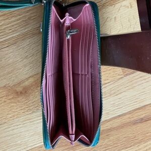 Elegant Fossil wallet with wrist strap. Sydney green leather. Some wear but lots of life left. Please see pictures for wear.