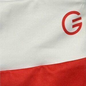 Bold reddish orange and white leggings. Perfect for active wear. Stylish and comfortable.
