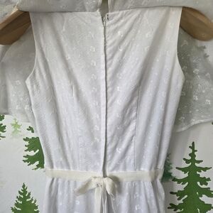 The dress features an empire waist, a long, flowing skirt with a ruffled hem, and a ruffled overlay across the shoulders and chest that functions as a capelet. It's 70's boho inspired style gives it a retro feel making it a great addition for a dressy casual or formal occasion. Pre-owned with no stains. No labels on size or fabrication.