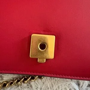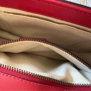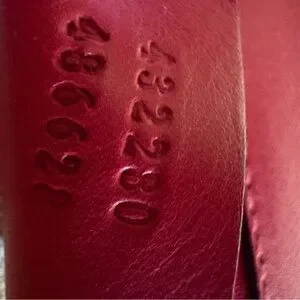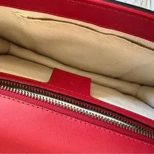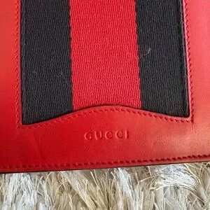 Features Guccis signature navy and red web stripe, elaborate crystal embellished eye and a gold tone metal bow.