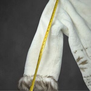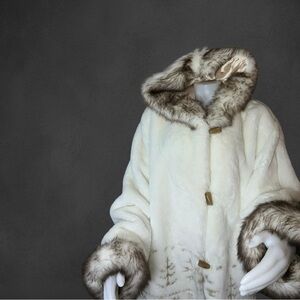 Stay warm and stylish in this beautiful winter coat featuring a plush ivory fleece faux fur body with soft, luxurious fleece faux fur trim on the collar and cuffs. The coat includes a white and brown details of snowflake/forest pattern along the bottom for a cozy, classic winter look.