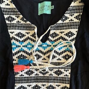Black cotton boho dress or swim coverup with colorful Aztec print, featuring a V-neckline and short sleeves #BohoChic #AztecPrint