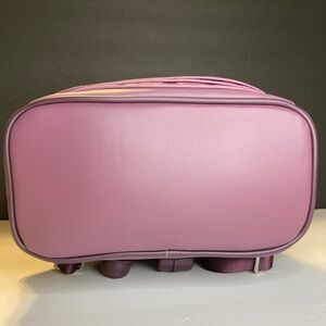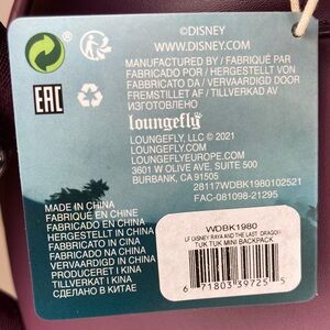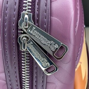 The Loungefly tag (plate, plaque) is purple metal with silver writing saying Disney above Loungefly.