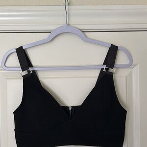 This sleek black crop top from Topshop features metal shoulder detail straps and a V-neckline with a notched center detail.