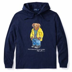 This Polo Ralph Lauren lightweight tshirt material pullover hoodie features the iconic Polo Bear graphic, dressed in a yellow raincoat, striped tee, and denim — a playful and classic look loved by Polo collectors. Made from 100% cotton, the fabric is soft and breathable with a lightweight fleece feel, perfect for everyday wear and layering.