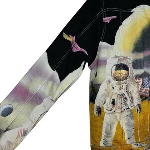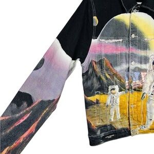 New with tags Lifted Anchors statement denim jacket featuring a bold allover astronaut and lunar landscape graphic. This button-front jacket has a classic denim silhouette with long sleeves, contrast stitching, and a striking space-inspired design on both the front and back. A standout piece for streetwear collectors and anyone who loves unique graphic outerwear.