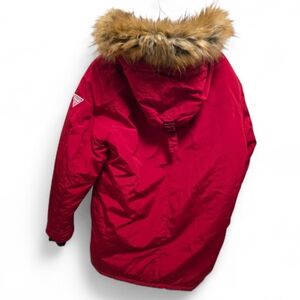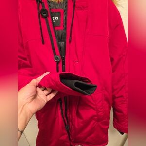 EUC mens red winter coat by Guess XL faux fur hood trim removable for easy cleaning water proof