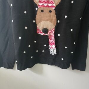 The Karen Scott Women's Size Large Knit Sweater is a charming and festive top perfect for the holiday season. Made of soft acrylic material in a tight-knit design, this black sweater features a classic crew neckline and long sleeves for comfort. With a playful Christmas reindeer pattern and stretchy fabric, it is ideal for both casual and party occasions, adding a touch of holiday cheer to your outfit. The pullover style and lightweight fabric make it easy to wear during the winter season, keeping you warm and stylish.