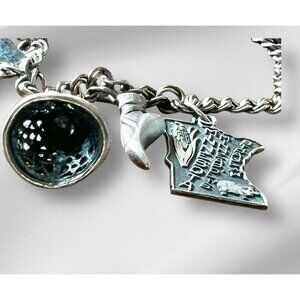 The bracelet is crafted from sterling silver, featuring detailed charms representing nature, beverages, and state pride. A versatile accessory with unique character.