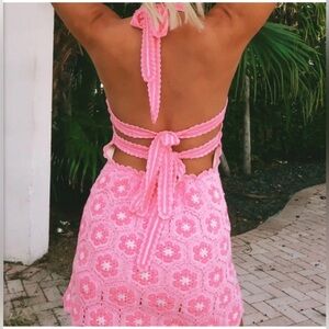 Limited Edition Happy Halter Mini Dress By Show Me Your Mumu + Barbie in size XLarge. Features a playful Barbie pink & magenta daisy crochet pattern; halter tie neck along with backless double ties that can be tied to your perfect fit!