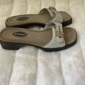Dr Scholl’s light gray leather slides sandals side buckle square toe block heels size 7 pre owned in good used condition normal wear see all pictures any questions please messageE2