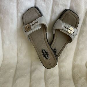 Dr Scholl’s light gray leather slides sandals side buckle square toe size 7