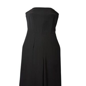 Black strapless wide leg jumpsuit with a flattering bodice and palazzo pant legs. This elegant one-piece offers a sophisticated silhouette perfect for a night out or a special occasion.