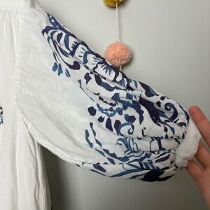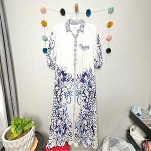 Beautiful watercolor navy floral flowy dress. Intricate detailing along buttons and near sleeves. Think sitting in the countryside by the water painting in Italy. So beautiful and unique. Collared detailing with buttons most of the way down. Three fourth sleeve style hugs near elbows. Size medium, fits oversized. Please note this doesn’t have the belt but can easily add your own! Linen and viscose blend with rayon lining. Great conditon!
