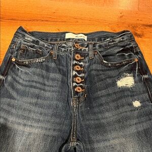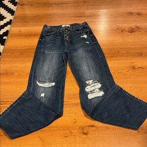 Chic flare jeans with distressed details. Button-up front. Perfect for casual style. Excellent condition