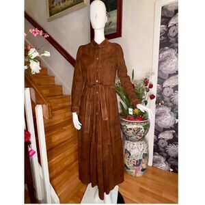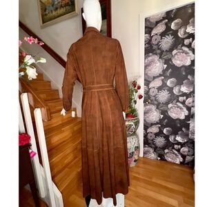 The perfect blend of western and vintage, this gorgeous lightweight coat is the perfect finish for any look featured in a beautiful pieced suede fabrication with contrast stitching and button-front closure in a longline silhouette.
