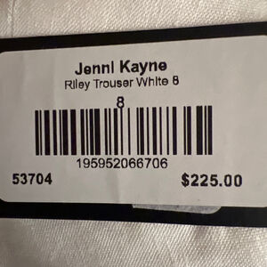 These Jenni Kayne Riley Trousers in white are a women's size 8, as indicated on the product tag. The trousers feature a relaxed fit with a box pleat in the front. They are made from a blend of 50% linen, 47% viscose, and 3% spandex, offering a lightweight feel. The garment was made in Turkey and has a retail price of $225.00.