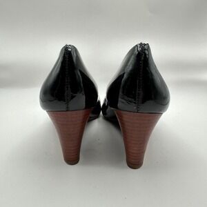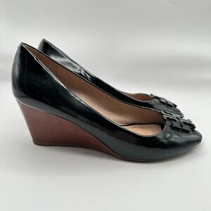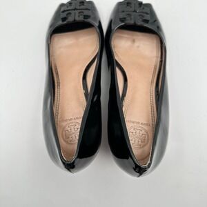Tory Burch Lowell Wedge Heels Womens 7M Black Patent Leather Peep Toe Luxury CEO