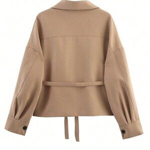 A casual elegant jacket for women in khaki, featuring a loose fit, long sleeves, a lapel neckline, and a strap detail for a secure fit.