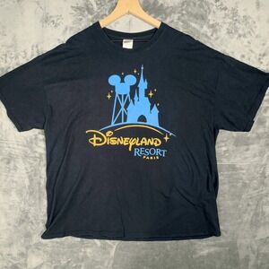 This men's Gildan t-shirt features a classic Disneyland Resort Paris graphic with the iconic castle and Mickey Mouse ears water tower design. The shirt is a size 2XL and comes in a solid black color made from 100% preshrunk heavy cotton. This short-sleeve tee is in pre-owned condition with some light cracking visible on the blue and yellow screen-printed graphic. It's a great casual shirt or souvenir for any Disney theme park enthusiast.