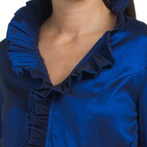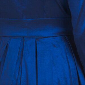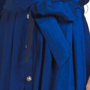 taffeta texture, fixed rolled cuffs, pleated skirt, button down skirt, ruffle neckline trim, detachable tie belt, fabric provides stretch