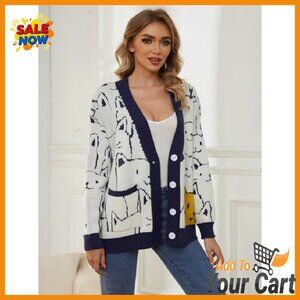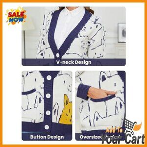 Style: Oversized button-down cardigan with V-neck and cartoon print