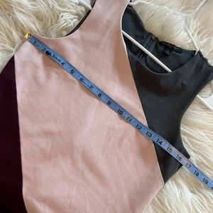 Stylish midi dress with a sleeveless design. Features bold diagonal color blocks. Perfect for any occasion.