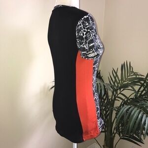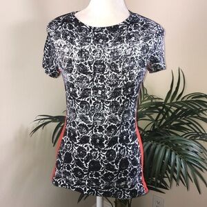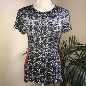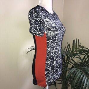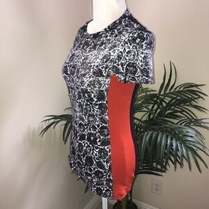 Great Cole Block Short Sleeve Tee. Black white floral print mixed with Black and Orange for a pop of color and contrast. Very funky. Unique. Minor wash wear. Chest 34 in before stretch. Length 24 in.