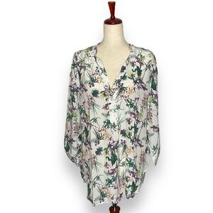NWT Amour Vert Silk White Floral Half Button Split Neck Pullover Blouse Medium
