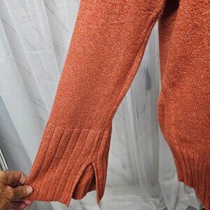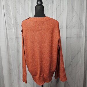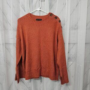 Cozy crew neck sweater. Features button details on shoulder. Ribbed cuffs and hem.