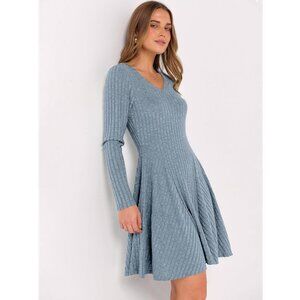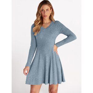 Women's Long Sleeve Ribbed Knit Short Dresses V Neck Swing Sweater Dress Blue