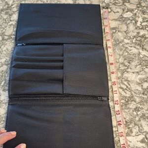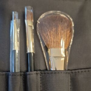 Luxurious black suede makeup case. Opens up to hold 5 brushes, 3 are included , a # 7, 2 and 4. has 2 zipper compartments with magnetic closure.