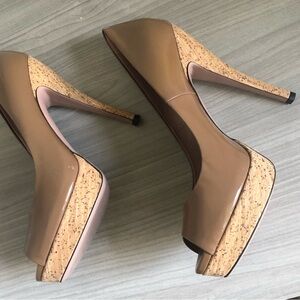 Stylish Gucci Crystal Pink Tan peep-toe cork heels in a sophisticated shape.. Perfect for any occasion. NWOT with original box