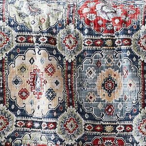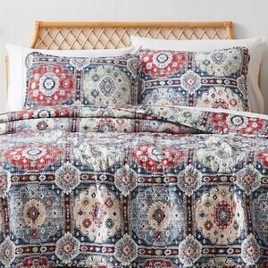 The two accompanying shams perfectly complement the quilt, adding a cohesive and polished look to your bedroom ensemble. The attention to detail in the design ensures that your entire bed exudes sophistication. This trendy quilt boasts muted shades of red, blue, gray, mint and cream