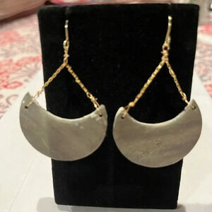 Wires are 14K gold filled, the "Moons" are a lightweight material but are sturdy. The backing is a soft grey felt like fabric. Handcrafted in Hawaii.