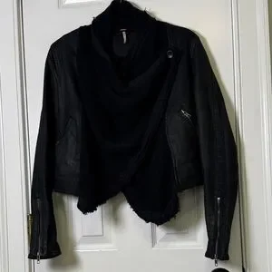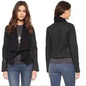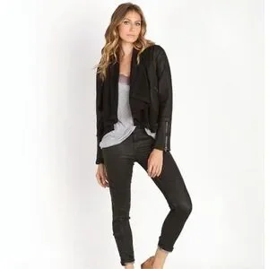 Free People Coated Denim Drape Front Moto Jacket Black Waterfall Collar XS 0