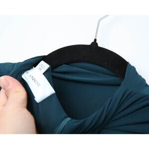 Details: The Ronny Kobo Sera Wrap Dress sculpts the silhouette with body-skimming ruching, a high neckline, and a dramatic side slit that elevates every step. Blue (90% Polyester, 10% Spandex). Cocktail dress. Mock neck. Long sleeve. Back zipper closure.