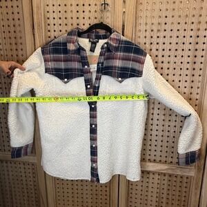 Keywords: womens sherpa shirt jacket, plaid fleece lined shirt, western snap front shirt, long sleeve flannel jacket, cozy sherpa top, designer inspired shirt jacket, casual outerwear women, fall winter fashion, trucker style shirt, oversized flannel shirt