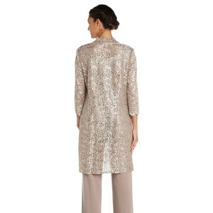This elegant set features a sleeveless top and an open-front style jacket. The sleeveless top sports a relaxed fitted round neckline with shimmering metallic lace. The longline open-style jacket with metallic lace that completes the set features scalloped hems and sheer 3/4 sleeves. When put together or when chosen to be worn in combination with other sets, will be stunning at any event!