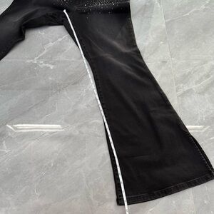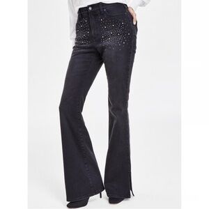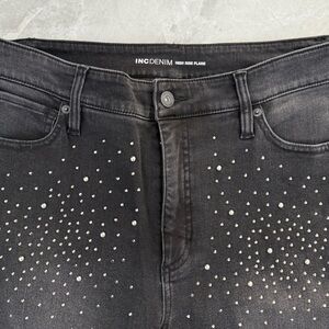 New without tags - NWOT Women’s INC Denim High-Rise Rhinestone Studded Flare Jeans Plus Size. Has three front pockets, two back pockets, slits on the bottom hem, and rhinestone studded front. Color: black. Size: 14 / 32.